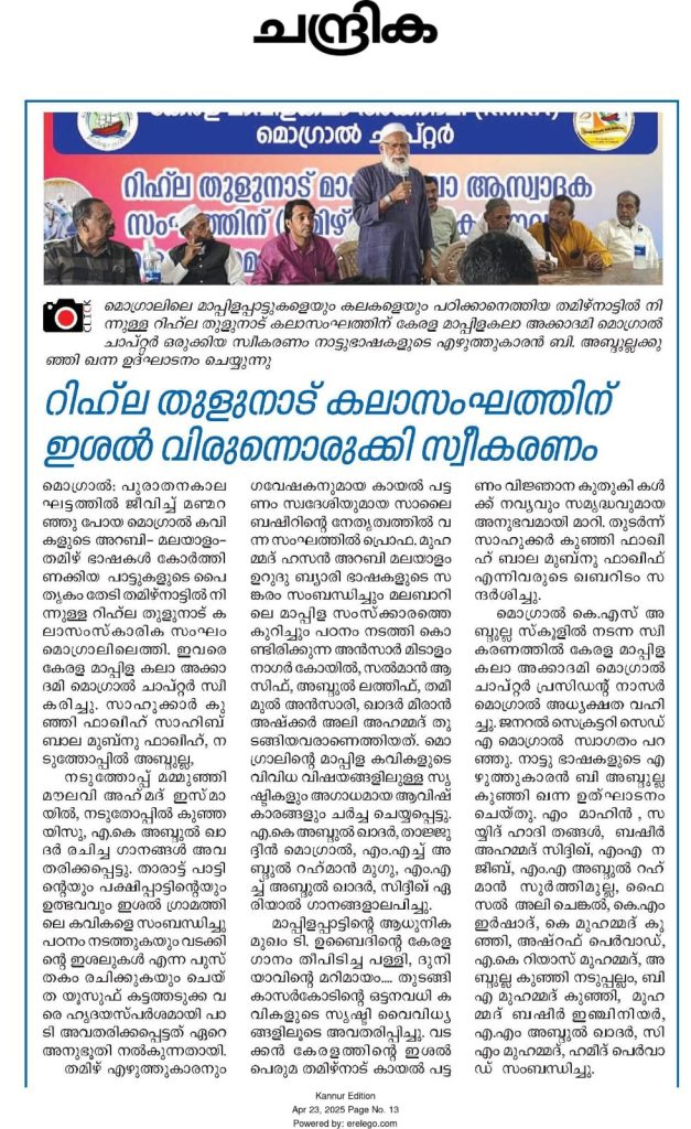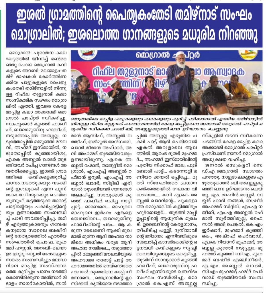 2&3. ரிஹ்லா துளுநாடு பயணக்குழுவினரை வரவேற்று மொக்ரால் மாப்பிளா கலா அகாடமியினர் நடத்திய மாப்பிளா இசை நிகழ்ச்சி பற்றிய சந்திரிகா உள்ளிட்ட மலையாள நாளிதழ்களில் வந்த செய்தி