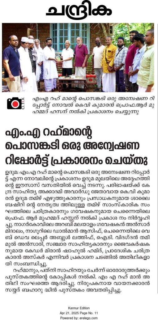 பொசங்கடி ஒரு அன்வேஷன ரிப்போர்ட்(பொசங்கடி – ஒரு விசாரணை அறிக்கை) கேரளியரின் புலம் பெயர் வாழ்க்கையின் தாக்கங்களும் விளைவுகளும்தான் இந்நாவலின் மையக்கருத்து. இந்நாவலை எம்.ஏ.ரஹ்மான் மாஸ்டரின் நண்பரும் சாஹித்ய அகாதமி விருது பெற்ற மலையாள எழுத்தாளருமான குமரன் உதும வெளியிட எங்கள் அணியின் சார்பாக வரலாற்றுப் பேராசிரியர் ஹஸன் அதனைப் பெற்றுக் கொண்டார்.